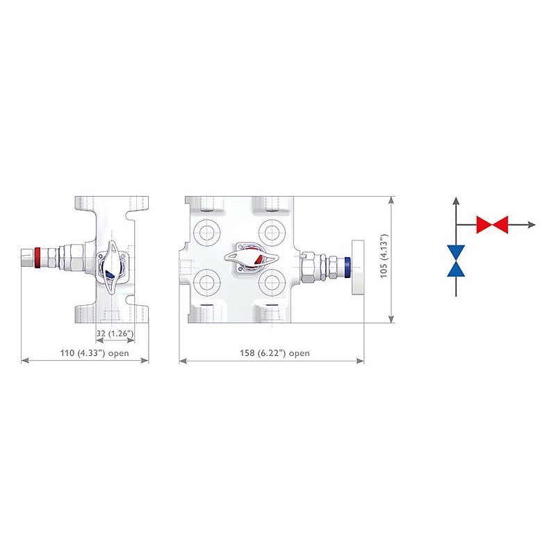 Integrierte 2-fach Ventilblöcke – Traditional-Ausführung von AS-Schneider sind zur Direktmontage an Rosemount 2051/3051 CoplanarTM Druckmessumformer vorgesehen. Der Standard-Entlüftungsanschluss ist 1/4 NPT Innengewinde. Verschlussschrauben sind nicht standardmäßig montiert. Zubehörsätze für die Montage der Ovalflansche an den Eingang der Ventilblöcke sind lieferbar.