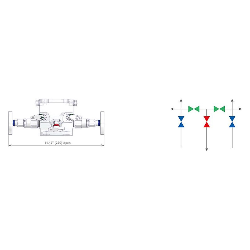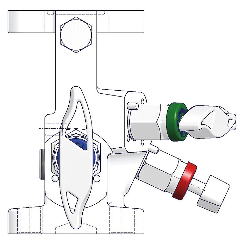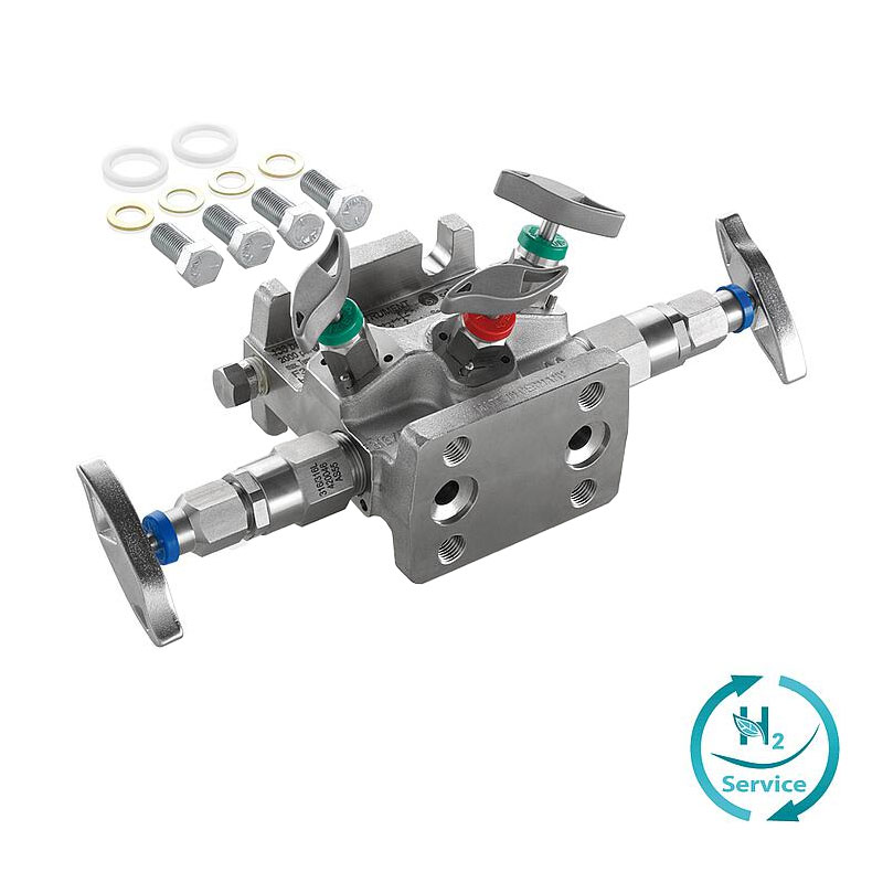 Ventilblöcke Typ H5A/H5S mit Weichsitz von AS-Schneider sind zur Direktmontage an Druck-Messumformer vorgesehen. Der Eingang des Ventilblocks (Prozessanschluss) hat standardmäßig einen Flanschanschluss. Der Standard-Entlüftungsanschluss ist 1/4 NPT Innengewinde und wird mit einem Insektenschutzstopfen standardmäßig geliefert. Die Prüfanschlüsse 1/4 NPT werden werkseitig mit einer montierten Verschlussschraube ausgeliefert. Die Ventilblöcke haben geschlitzte Schraubenlöcher, deshalb sind zur Befestigung der Messumformer Zubehörsätze mit Unterlegscheiben erforderlich.