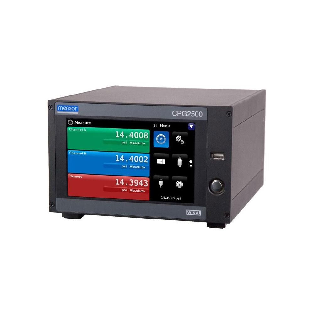 Das CPG2500 kann mit einem, zwei oder drei Drucksensoren konfiguriert werden. Zwei Sensoren sind intern und der dritte ist extern. Die Drucksensoren sind pneumatisch isoliert, sodass ein Kanal mit einem Sensor mit bis zu2.895 bar [42.000 psi] und gleichzeitig ein anderer mit minimal25 mbar [10 inH2O] konfiguriert werden kann. Ein optionaler barometrischer Referenzsensor kann intern hinzugefügt werden, um den barometrischen Druck anzuzeigen oder um den Relativdruck bzw. den Absolutdruck zu emulieren. Die Druckbereiche jedes Kanals werden vom Kunden festgelegt. Standard- und Premiumsensoren sind intern vorhanden. Bei den externen Sensoren handelt es sich um die digitalen Drucksensoren CPT9000, CPT6100 bzw. CPT6180 von Mensor.