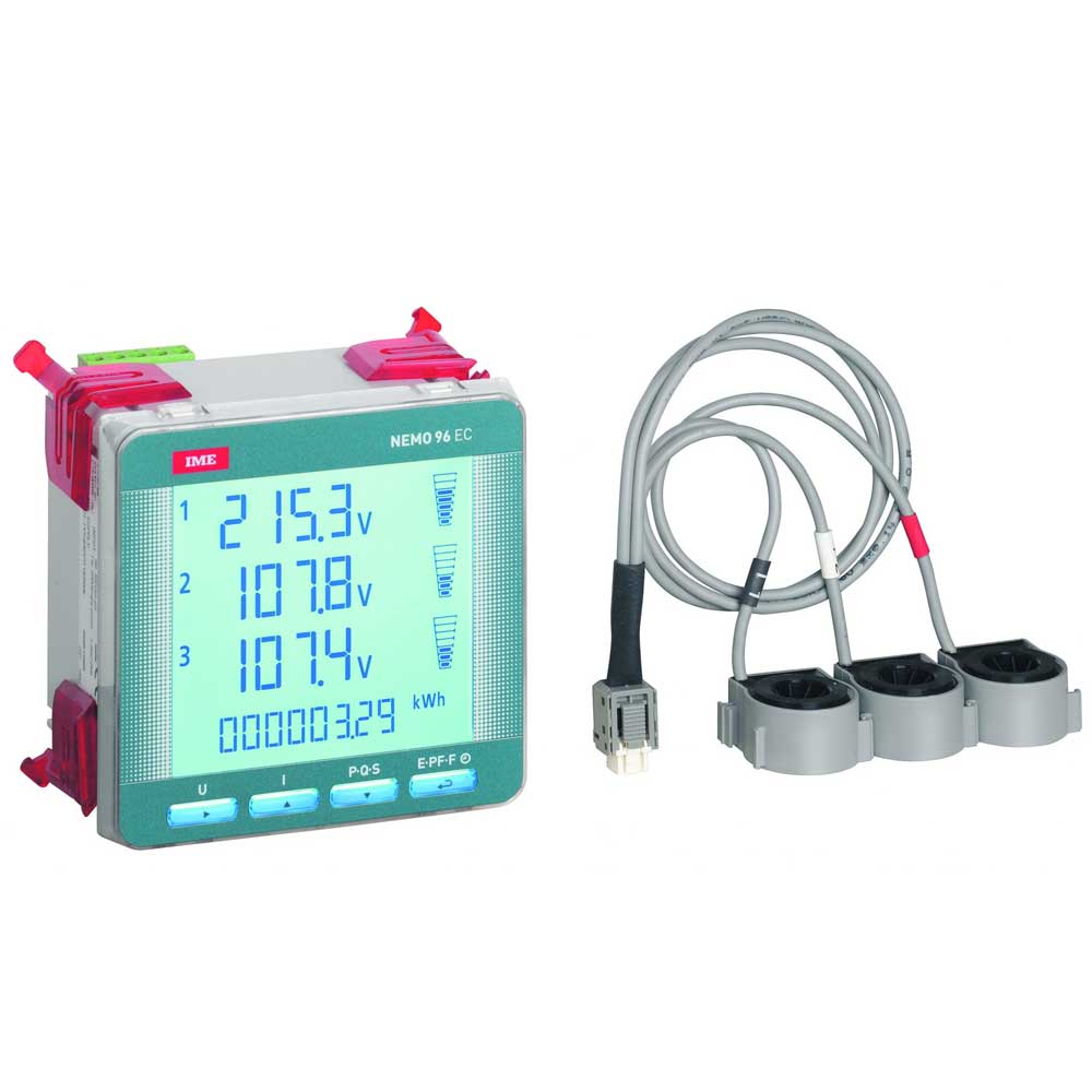 Multifunction control unit built-in version direct connection 63A via miniaturized Rogowski coils with closed core prewired cable L. 0.35m quick connection. Modbus communication output, LCD display.