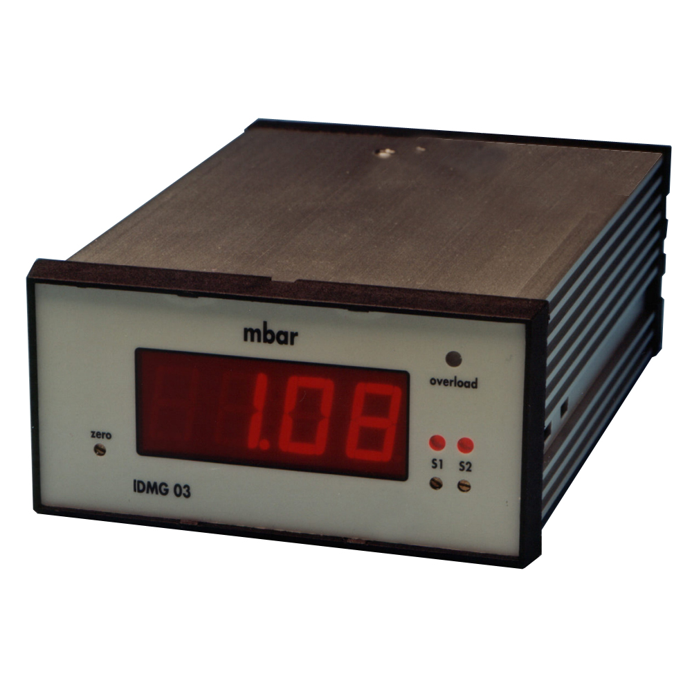 Die Druckmessgeräte der Baureihe IDMG3 erfassen neben Differenz- und Absolutdruck auch positiven und negativen Überdruck und wahlweise Volumenstrom für Luft und nicht aggressive Gase. Diese Prozessgrößen werden auf einem 3,5-stelligen LED-Display mit 14,2 mm Ziffernhöhe angezeigt sowie einem standardmäßig vorhandenen 0-10V-Analogausgang zugeführt. Durch den Einsatz piezoresistiver Messelemente wird eine hohe Zuverlässigkeit und Genauigkeit erreicht. Die Verwendung robuster Aluminiumgehäuse ermöglicht nicht nur eine hohe mechanische Stabilität, sondern auch sehr gute EMV-Eigenschaften. Durch eine frontseitig angebrachte LED wird der Anwender auf Drucküberlastung durch Überschreiten des Messbereiches hingewiesen. Beim Typ IDMG3-2 sind zusätzlich zwei Schaltausgänge vorhanden, deren Zustand über jeweils eine LED angezeigt wird. Alternativ zum IDMG3-2 steht das IDMG3-3 mit 4-20 mA -Transmitter zur Verfügung. Der Typ IDMG3-4 ohne Schaltausgang verfügt über eine RS 232 – Schnittstelle. Ein Frequenzausgang 0-10 kHz ist ebenso lieferbar.