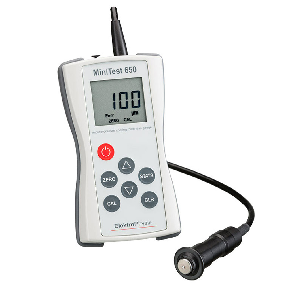 The MiniTest 650 has a fixed external probe for all non-magnetic coatings on steel and all insulating coatings on nonferrous metals. For measurement on rough steel surfaces, e.g. in shipyards, the F probe comes equipped with special wear protection to ensure long service.
