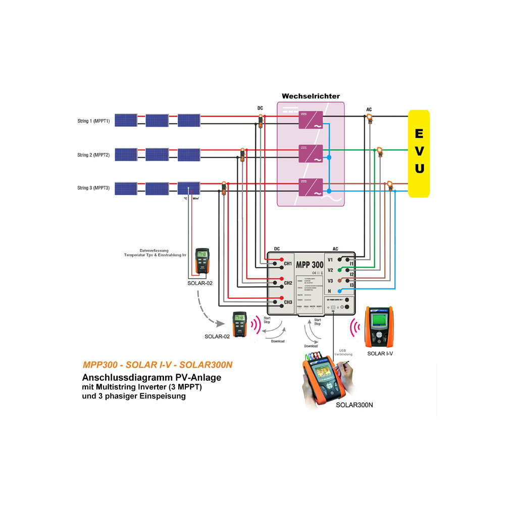 Das MPP300 eignet sich als exklusives Zubehör für das SOLAR300N und SOLAR I-V als Messsystem zur Durchführung von Leistung- und Ertragsanalysen an 1 und 3 phasigen PV Anlagen mit bis zu 3 Multistring Wechselrichtern und ist die ideale Lösung für die Prüfung und Analyse der gesamten PV Anlage.