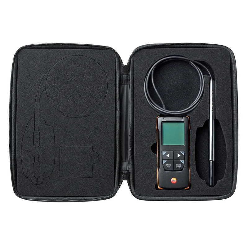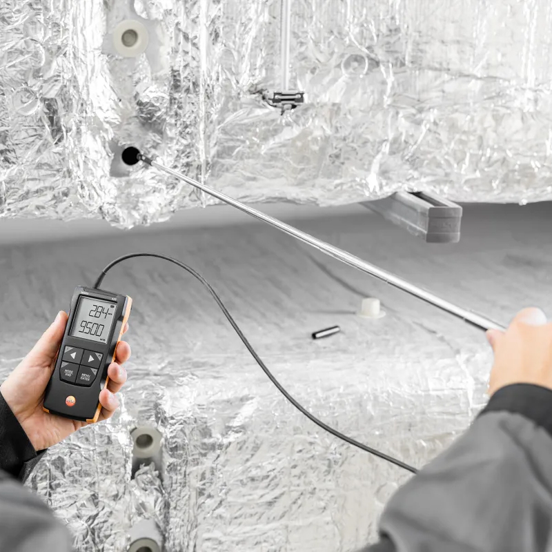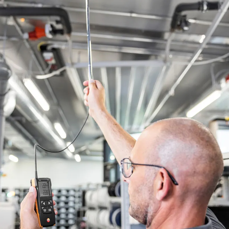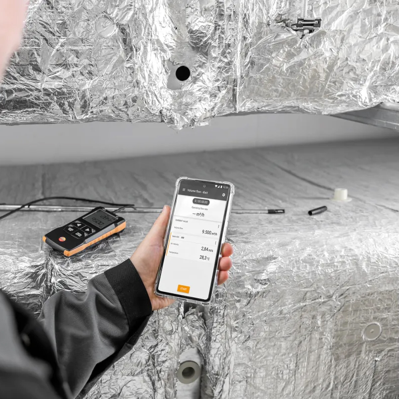 Das kompakte Hitzdraht-Anemometer testo 425 mit Teleskopsonde eignet sich ideal für die einfache, schnelle und präzise Ermittlung von Strömungsgeschwindigkeit und Volumenstrom in Lüftungskanälen von Klima- und Lüftungsanlagen. Die Anbindung an die testo Smart App ermöglicht Konfiguration, Anzeige (auch als Second Screen) und Speicherung sowie Dokumentation der Messung direkt in der App.
