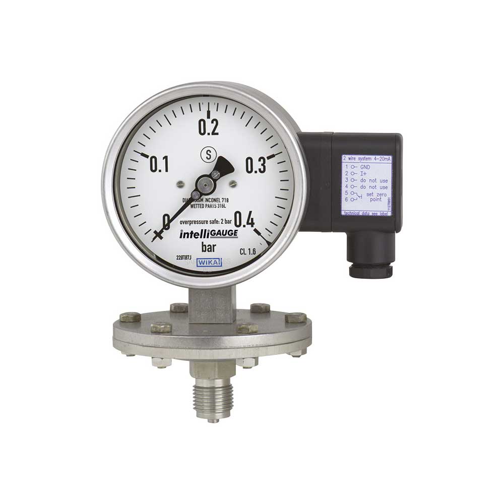 An electronic angle encoder, proven in safety-critical automotive applications, determines the position of the pointer shaft – it is a non-contact sensor and therefore completely free from wear and friction. From this, the electrical output signal proportional to the pressure, e.g. 4 … 20 mA, is produced. The measuring span (electrical output signal) is adjusted automatically along with the mechanical display, i.e. the scale over the full display range corresponds to 4 … 20 mA. The electrical zero point can also be set manually. The electronic WIKA sensor, integrated into the high-quality diaphragm pressure gauge, combines the advantages of electrical signal transmission with a local mechanical display that remains readable during a power failure.