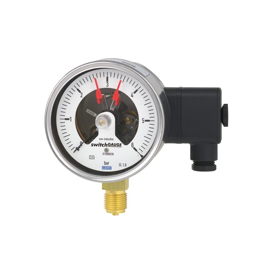Wherever the process pressure has to be indicated locally and, at the same time, circuits need to be switched, the model PGS21.1×0 switchGAUGE finds its use. Switch contacts (electrical alarm contacts) make or break an electric control circuit dependent upon the position of the instrument pointer. The switch contacts are adjustable over the full extent of the scale range (see DIN 16085), and are mounted predominantly below the dial, though also partly on top of the dial.
